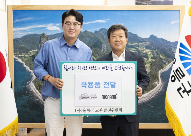 지난 10일(화) (사)독도사랑운동본부와 ㈜모나미는 울릉군 학생들을 위해 (사)울릉군교육발전위원회(이사장 한익현)에 네임펜 24색 세트, 볼펜 등 800만원 상당의 학용품을 공동 기탁하였다. 기탁식에는 (사)독도사랑운동본부 조종철 사무국장, (사)울릉군교육발전위원회 남한권 이사가 참석했다. 이날 기탁식에 참석한 조종철 사무국장은 “독도와 가장 가까이 사는 우리 지역 학생들이 꿈을 이루는데 도움이 되었으면 하는 마음으로 학용품을 기탁하게 되었다.”고 말했다. 이에 남한권 이사는 “지난번에 이어 울릉군 학생들을 위해 다시 한번 학용품을 기탁해 주셔서 감사드리고, 이 자리에 참석하지 못한 모나미 측에도 깊은 감사의 말씀을 드린다.”며, “기탁해 주신 학용품은 지역 학생들에게 잘 전달하겠다.”고 고마움을 전했다. 개인 일정으로 부득이하게 참석하지 못한 (사)울릉군교육발전위원회 한익현 이사장도 “우리 지역 학생들을 위해 뜻깊은 기부를 해주셔서 감사드리고, 기탁해 주신 학용품은 지역 학생들이 부족함 없이 학업에 전념하는데 사용할 수 있도록 하겠다.”며 감사의 뜻을 전했다. 한편, (사)독도사랑운동본부와 ㈜모나미는 지난 2022년 10월 28일 서울 광화문에서 울릉군 지역 학생들을 위해 볼펜, 풀 등 600만원 상당의 학용품을 기탁했었다.