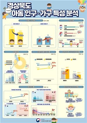 ▣경북 아동인구 감소부모 평균 연령은 아버지 43.6세, 어머니 40.7세며 사교육 참여율은 72.8%, 월평균 사교육비는 29만4000원으로 조사됐다.25일 동북지방통계청이 발표한 `경북도 아동 인구·가구 특성 분석`에 따르면 2022년 경북의 아동(0~18세 미만)인구는 34만명으로 2015년 대비 9만1000명(21.1%) 감소했다. 전체인구 비중(13%)도 7년 전 보다 3.1%p 줄었다.아동 가구(18세 미만 아동이 사는 가구)는 20만7000가구로 2015년보다 20.2% 감소했다. 아동 가구는 전체 가구의 17.7%로 2015년보다 6.7% 감소했다. 가구당 아동수는 1.59명으로 2015년 대비 0.01명 감소했다.다문화 아동 인구는 1만8000명으로 2015년보다 4000명(30.9%) 증가하고 비중(5.4%)도 2.2%p 증가했다. 13~17세 283.7%, 7~12세는 56.7% 증가했고 0~6세는 24.1% 감소했다. 경북 다문화 아동 가구는 1만2000가구로 2015년 대비 28.8% 증가했다. 가구당 아동수는 1.56명으로 2015년 대비 0.01명 늘었다.경북의 2022년 아동 가구 부모 평균 연령은 아버지 43.6세, 어머니 40.7세로 2015년보다 1.8세 각각 늘어났다. 다문화 가구 아버지의 연령은 49세, 어머니의 연령은 36.3세로 나타났다. 2015년 대비 아버지는 5.4세, 어머니는 4.4세 증가했다.부모 평균 연령은 0세가 아버지 35.6세, 어머니 32.9세로 2015년 대비 1.3세, 1.2세 각각 증가했다. 초1, 7세 부모의 평균 연령은 41.4세, 38.7세로 2015년 대비 1.1세, 1.6세 각각 늘었다. 중1, 13세 부모의 평균 연령은 46.4세, 43.4세로 2015년 대비 1.5세, 1.3세 각각 증가했다.영유아(0~6세) 아동의 부 연령은 35~39세(36.4%), 40~44세(30%), 30~34세(17.5%) 순으로 나타났다. 2015년 대비 40세 이상은 12.9%p 증가했다. 어머니의 연령은 35~39세(38.2%), 30~34세(28.4%), 40~44세(21.1%) 순으로 2015년 대비 40세 이상은 12.2% 증가했다.양육유형은 양부모 양육(86.1%), 한 부모 양육(9%), 부모 미 양육(5%) 순이었다. 양부모 양육은 아동 연령이 높을수록 감소하고, 한 부모 양육과 부모 미양육은 아동 연령이 높을수록 증가했다. 한 부모 양육 전체 가구 중 어머니 양육(62.2%)은 아버지 양육(37.8%)보다 2배 많았다.경북 양부모 양육 가구 중 맞벌이(67.7%)는 2015년 대비 9.7%p 늘었고 전국(72.5%) 보다 4.8%p 적었다. 맞벌이 가구 비중은 아동 연령 13~17세(72.2%)가 가장 높았고 0~6세(63%)는 전국(70.1%)보다 7.1%p 낮아 격차가 가장 큰 것으로 나타났다.외벌이 가구(30.3%)는 2015년 대비 8.2%p 줄었고 전국(26.3%)보다 4%p 많았다. 외벌이 가구 비중은 아동연령 0~6세(35%)가 전국(28.8%)보다 6.2%p 높았다.양부모 양육 가구의 가구당 아동수는 맞벌이와 외벌이 모두 1.62명으로 나타났다. 외벌이의 경우 부 외벌이(1.63명)가 모 외벌이(1.61명)보다 0.02명 많았다. 부모 소득별 가구당 아동수는 부모 소득 1억원 이상(1.64명)이 가장 많았고 3000만~5000만원 미만(1.58명)이 가장 적었다.경북도의 부모 육아 휴직률(10.6%)은 2015년 대비 4.2%p 늘었지만 전국(11.7%)보다 1.1%p 낮았다. 아버지의 육아 휴직률(4.2%)은 2015년보다 10배 증가했지만 어머니(21.2%)의 5분의 1 수준이다.양부모 양육 육아 휴직률(14.5%)은 한 부모 양육(5.7%)에 비해 2배 이상 높았다. 기업체 규모별 보면 아버지의 육아 휴직률은 공공행정 등 기타(7.8%), 대기업(4.6%)이 높았지만 규모가 작은 소상공인(1.6%), 중소기업(2.2%)은 낮았다. 어머니의 경우 대기업(31.8%), 공공행정 등 기타(26.5%)가 높은 반면 규모가 작은 소상공인(7.1%), 중소기업(13.8%)은 낮았다.부모 모두 육아 휴직률은 0세 이후 6세까지 감소하다 초1 학령인 7세에서 증가했다. 모의 육아 휴직률은 2015년 대비 아동 연령 1세(15%p), 0세(14.5%p)에서 가장 많이 증가한 것으로 나타났다.2022년 어린이집·유치원 시설은 2145곳으로 2015년보다 24.5% 감소했고 아동 인원은 27.3% 줄었다. 아동 가구의 주택 소유 비율은 64.5%로 전국보다 3%p 높다. 전체 아동 중 기초생활보장 일반수급 아동수는 1만9000명으로 전체 아동 중 5.6%를 차지했다. 전국 4.5% 보다 1.1%p 높은 수치다.초중고 사교육 참여율은 72.8%로 전국보다 5.5%p 낮았다. 학교급별로는 초등학교(81.4%)가 가장 높았고 월평균 사교육비는 29만4000원으로 전국보다 11만6000원 적었다. 2015년 대비 10만4000원, 54.7% 증가한 것으로 나타났다. 중학교(32만4000원), 고등학교(28만6000원), 초등학교(28만4000원) 순이었다.동북지방통계청은 저출생 현상이 지속됨에 따라 지역 학령인구 및 산업인력 감소 등으로 이어져 이를 완화 및 해결하기 위한 관련 정책이 필요함에 따라 경북도의 아동인구 정책을 지원하기 위해 통계청 아동가구통계등록부 등을 활용, 아동 인구·가구 현황과 부모의 일자리, 육아휴직 등 양육 환경을 분석했다.