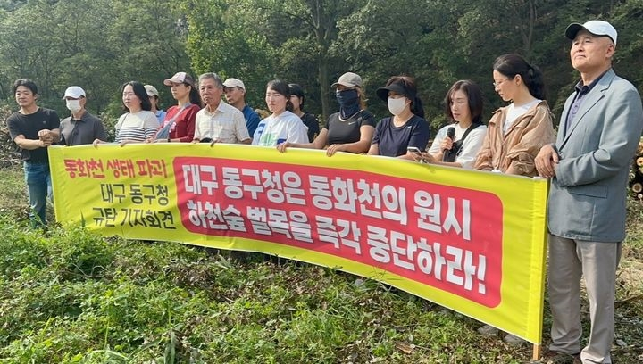 대구 동구청이 침수 피해 예방을 위해 금호강 지류 인근 동화천 숲에 대규모 벌목을 진행하자 환경단체가 생태계를 망가뜨리고 있다며 규탄했다.금호강난개발저지대구경북대책위원회 등은 27일 동화천 옆 공사 현장에서 기자회견을 열고 "원시 자연성이 살아있는 동화천 싹쓸이 벌목 단행한 대구 동구청을 규탄한다"고 밝혔다.단체는 "동화천은 팔공산에서 발원해 금호강으로 흘러드는 금호강의 지류로 대구의 마지막 자연하천이라 평가받는 아름다운 하천"이라며 "그런데 동구청에서 싹쓸이 벌목을 단행해 동화천 생태계를 망가뜨리고 있다"고 주장했다.나아가 "동화천은 화담산의 수목이 그대로 내려온 듯 왕버들 군락이 화담산 수목과 조화를 이뤄 아름답게 자라난 곳이라 특히 주민들의 사랑을 받는 구간"이라며 "이곳은 생태적 온전성이 아주 뛰어난 곳으로 정비가 아닌 필히 보전이 돼야 하는 구간"이라고 말했다.그러면서 "동화천을 따라 우후죽순 택지와 아파트를 조성한 것부터가 도시계획적으로 무리한 것"이라며 "구청은 즉시 동화천 하천정비사업을 중단하고 환경단체와 이곳 주민들과 긴밀히 논의해 동화천의 생태적 온전성을 살릴 방법들을 강구하라"고 촉구했다.공사 구간은 대구 동구 지묘동 1345 일대로 왕산교에서 대원사까지 대략 2㎞ 구간이다. 구청은 하천 안에 자란 수목을 모두 제거하고 호안의 법면을 정비하고 자연석을 쌓는 공사를 할 계획이다.동구청은 왕산교 위 지묘동 쪽의 강변에 놓인 산책로와 체육시설 등이 해마다 물에 잠겨 피해를 입고 있어서 하류에 수목들을 제거해 강물이 원활하게 빠지게 하기 위함이라고 해명했다.