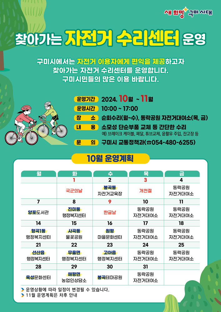 이번 서비스는 방치된 자전거를 수리해 자전거 이용과 자원 재활용을 촉진하고, 무상 수리로 시민들의 경제적 부담을 덜어주기 위해 마련됐다.운영시간은 오전 10시부터 오후 5시까지이며, 10월 일정은 △2일(수) 봉곡동 자전거교육장 △7일(월) 양포도서관 △8일(화) 진미동 행정복지센터 △14일(월) 형곡1동 행정복지센터 △15일(화) 사곡동 물꽃공원 △16일(수) 원평마을문화센터 △21일(월) 선산읍 행정복지센터 △22일(화) 무을면 행정복지센터 △23일(수) 고아읍 행정복지센터 △28일(월) 옥성문화센터 △29일(화) 해평면 농업인상담소 △30일(수) 봉곡테마공원에서 진행된다.목요일과 금요일은 동락공원 자전거대여소에서 운영된다. 11월 일정은 추후 안내할 예정이다.자전거 수리는 펑크 수리, 브레이크 케이블, 페달, 윤활유 주입, 소모성 단순 부품 교체 등 간단한 수리와 점검을 무상으로 제공한다. 수리 범위 외 부품 교체가 필요한 경우에는 지역 경제 활성화를 위해 인근 수리점으로 안내할 예정이다.김장호 구미시장은 "자전거는 저탄소·무동력 친환경 교통수단으로 환경과 주차 문제에 효과적인 대응책”이라며, “이번 수리센터 운영을 통해 시민들이 많은 혜택을 보길 바라며, 도심 내 자전거 활성화를 위한 다양한 사업을 지속하겠다”라고 했다.한편, 구미시는 자전거 이용 활성화를 위해 자전거보험 가입, 자전거 대여소 2개소 운영, 두바퀴 안전점검단 운영, 녹색자전거 대행진, 두바퀴 이동수단 안전교육 등 다양한 사업을 추진하고 있다.