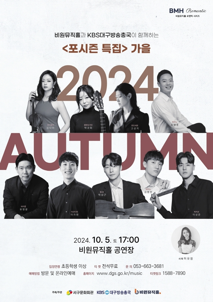 서구 비원뮤직홀은 5일, KBS대구방송총국과 공동기획으로 포시즌 특집 ‘2024 가을’을 개최한다.비원뮤직홀과 KBS대구방송총국은 지역의 클래식 공연을 활성화하고 지역민에게 보다 수준 높은 문화향유기회를 제공하고자 공동기획으로 2024년 포시즌 특집 시리즈 4건을 함께한다.포시즌 특집은 안토니오 비발디의 작품 ‘사계(Le quattro stagioni[이태리어])’를 영어로 표현한 ‘포시즌’에서 착안한 시리즈이며, 이름의 유래처럼 봄, 여름, 가을, 겨울 분기마다 진행하는 시리즈 공연이다.올해 진행하는 포시즌 특집 중 ‘2024 봄’과 ‘2024 여름’은 각각 지난 3월과 6월 성황리에 마쳤다. 피아노의 시인 ‘윤홍천’과 독일 뮌헨 음대 교수로 재직중인 ‘닐스 묀케 마이어’, 스마일 테너 ‘권화평’ 등 수준급 아티스트가 선보이는 공연에 많은 관람객이 호평을 한 공연이었다.5일 진행되는 공연은 포시즌 특집 세 번째인 ‘2024 가을’로 국내 최정상급 예술가 및 지역 청년 예술가의 무대를 준비해 지역민에게 선보이고자 한다.하노버 국제 콩쿠르 우승과 31세의 젊은 나이에 서울대 음악대학 조교수에 임명되며 예술계를 떠들썩하게 했던 바이올리니스트 김다미와 클래식 기타 하나로 유럽의 각종 대회를 석권하며 열두 장의 앨범을 발표한 기타리스트 박규희, 대한민국을 대표하는 반도네오니스트 고상지가 출연해 화려한 악기의 매력을 선보인다. 메트로폴리탄 국제 음악 콩쿠르 1위를 수상하고 tvN유퀴즈 온 더 블록에 출연하며 인지도를 쌓은 바리톤 유영광이 출연해 공연의 완성도를 더한다.공연진행은 KBS공채 50기 아나운서 허유원이 진행한다.관람은 초등학생 이상, 전석무료로 진행되며, 예매는 9월 30일(월) 오전 9시부터 1인 2매까지 온라인과 방문예매가 동시에 진행된다. 자세한 사항은 비원뮤직홀 홈페이지(https://www.dgs.go.kr/music)를 참고하거나 비원뮤직홀(☎053-663-3681)로 문의하면 된다.