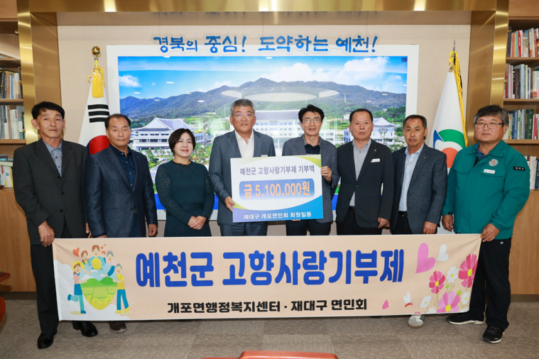 예천군(군수 김학동)은 8일 재대구 개포면민회 회원들로부터 고향사랑기부제 기부금 510만 원을 전달받았다.