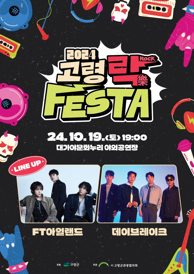 고령군(군수 이남철)은 오는 10월 19일(토) 오후 7시 대가야문화누리 야외공연장에서 ‘2024 고령 락(ROCK, 樂) 페스타’를 개최한다. 이번 행사는 대한민국 대표 뮤직 페스티벌 행사로의 도약 및 자리매김을 하기 위해 기획되었고, 지역 주민과 관광객 누구나 열린 공간에서 음악을 즐기며 일상 속 즐거움을 채운다는 의미를 담고 있다. 올해 두 번째로 개최되는 락(ROCK, 樂) 페스타는 전석 무료 공연으로 진행되며 ‘사랑앓이’,‘지독하게’등 다수의 히트곡을 보유하고 있는 FT아일랜드와‘좋다’,‘들었다 놨다’등으로 사랑받고 있는 데이브레이크가 출연할 예정이다. 고령군(군수 이남철)은 “젊고 역동적인 문화관광도시 브랜드 형성을 도모하는 장이 될 것”이라며 “고령 락(ROCK, 樂) 페스타에서 일상 속 행복과 즐거움을 누리기 바란다”고 말했다. 또한 이날 오후 1시에는 고령 지산동 고분군 유네스코 세계유산 등재 및 대가야 고도(古都)지정 기념으로 ‘제1회 대가야 왕릉 전국 가요제’ 본선도 개최될 예정이다.