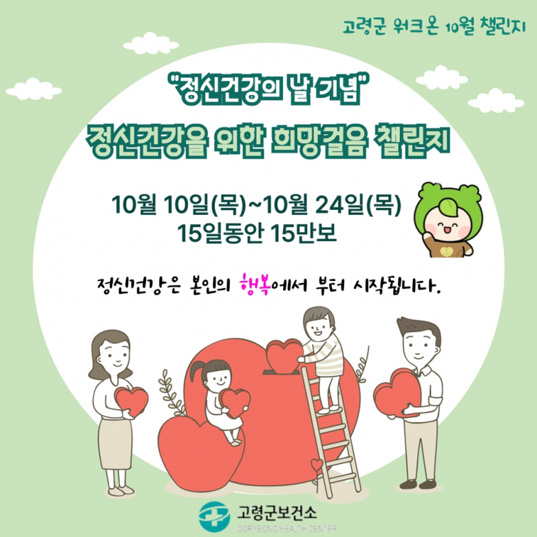 고령군(군수 이남철)은 모바일 걷기 앱 ‘워크온’에서 15일간 10월 10일(목)부터 10월 24일(목)까지 세계 정신건강의 날 기념 ‘정신건강을 위한 희망의 걸음 챌린지’를 실시한다. 세계 정신건강의 날은 세계정신건강연맹(WFMH)이 정신질환에 대한 관심을 제고하고 편견을 타파하기 위해 매년 10월 10일로 제정하여 기념하고 있다. 이에 고령군에서도 정신건강에 대한 중요성과 심각성을 인식하고 지자체 차원의 책무와 예방 등의 사항을 규정한 ‘고령군 정신건강증진 조례’를 경북 지자체 최초로 2023년에 제정하여 고령군정신건강복지센터에서 활발한 정신건강사업을 추진하고 있다. 고령군 주민이라면 누구나 참여가 가능하고 1걸음에 1마일리지가 적립되어 1일 최대 1만2천 마일리지(1만2천 걸음까지 인정)가 적립된다. 챌린지 기간 중 목표 걸음 수(15만보)를 달성하면 고령군정신건강복지센터에서 마련한 선물 응모가 가능하다. 참여를 위해서는 먼저 모바일 걷기 앱 워크온을 설치하고 ‘고령군 공식 커뮤니티’에 가입한 이후 챌린지 참여를 하여 스마트폰을 소지하고 걸으면 된다. 김곤수 보건소장은 “선선한 가을바람을 맞아 생활 속 걷기를 통해 본인의 정신건강에 관심을 가지고 건강한 마음을 위한 정신건강 관리 문화가 조성되길 희망한다” “이와 함께 본인의 마음 건강을 점검해보는 기회가 되길 바란다”고 전했다.