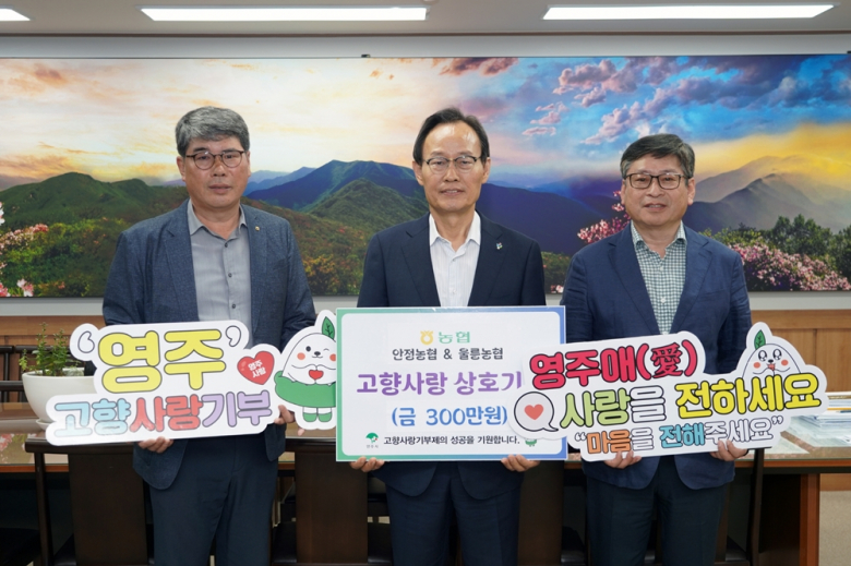 영주시는 안정농협과 울릉농협이 고향사랑기부금 상호기부에 동참했다고 18일 밝혔다.이날 영주시청에서 열린 상호기부 약정식에는 손기을 안정농협 조합장, 정종학 울릉농협 조합장 등 6명이 참석해 서로의 발전을 응원하며 각각 300만원을 기부하였다.손기을 안정농협 조합장은 “울릉농협과의 상호기부를 통해 두 지역이 함께 성장하고 발전할 수 있는 계기를 마련하게 되어 기쁘다. 앞으로도 지속적인 협력을 통해 지역사회의 상생을 도모하겠다”고 말했다.박남서 영주시장은 “안정농협과 울릉농협의 뜻깊은 기부에 감사드린다”며, “이번 기부를 통해 지역의 주민들이 보다 나은 삶을 영위할 수 있도록 최선을 다하겠다”고 전했다.한편, 고향사랑기부제는 개인이 주소지 외의 지방자치단체에 연간 500만 원 이하의 금액을 기부하면 세액공제(10만 원까지 전액, 초과분 16.5%)와 답례품(기부액의 30% 이내) 혜택을 받을 수 있는 제도이다. 기부는 ‘고향사랑e음’ 사이트를 이용하거나 전국 모든 농협은행(지역농⸱축협 포함)을 방문해 할 수 있다.전상기 기자