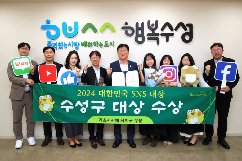 수성구청이 2024 대한민국 SNS 대상 기초지자체(자치구) 부문에서 대상을 수상하는 쾌거를 거뒀다.김대권 대구 수성구청장은“SNS는 주민과 공감·소통하는 중요한 홍보매체다 앞으로도 다채롭고 재미있는 수성구 맞춤형 콘텐츠 제작으로 주민들과의 소통을 강화하는데 최선을 다하겠다”라고 말했다.올해로 14회째를 맞은‘대한민국 SNS대상’은 (사)한국소셜콘텐츠진흥협회가 주최·주관하고 과학기술정보통신부 등이 후원한다.올바른 SNS 활용 문화 정착을 위하여 이용자와 활발히 소통하고 있는 기업과 기관을 선정해 시상하는 소셜미디어 분야 국내 최고 권위의 행사이다.7~9월까지 두달 간 진행된 이번 평가는 활용 지수, 영향력 지수 등의 정량 평가와 심사위원 및 내부 전문가 평가 그리고 사용자 투표로 심사하여 최종 수상자를 선정했다.사용자 투표에서는 천명이 넘는 주민들이 수성구를 투표해 수상에 힘을 보탰다.수성구는 이용자의 눈높이에 맞는 다양한 맞춤형 콘텐츠 제작으로 구정 소식을 쉽고 정확하게 전달함과 동시에 수성구 캐릭터‘뚜비’를 활용한 친근하면서도 차별화된 디자인의 카드뉴스로 좋은 평가를 받았다. 다양한 연령층의 이용자 확보를 위해 감각적인 디자인과 트렌디한 소재를 활용한 기획·쇼츠 영상과 수성 웹툰을 제작해 연령대에 맞는 우수한 콘텐츠로 기획력을 인정받았다.앞으로도 유튜브, 인스타그램, 블로그 등 다양한 소셜미디어 채널을 활용하여 일방적인 정보제공을 지양하고 이용자간 실시간 소통을 강화하는 등 행복 수성 브랜드 이미지 구축에 힘을 모은다.수성구는 같은 대회에서 2020년 ~ 2021년 2년 연속 대상 수상, 2023년에는 최우수상을 수상했다. (사)한국인터넷전문가협회가 주최하는 소셜 인터넷 서비스 혁신 대상 시상 행사인 소셜아이어워드 페이스북 분야에서도 2022 ~ 2024년 3년 연속 대상을 수상하며 명실상부 온라인 소통 1번지임을 입증받았다.