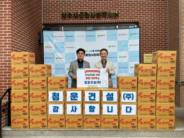 상주시종합사회복지관은 지난 17일 김정식 청운건설(주) 대표가 ‘사랑의 라면 100박스’를 후원해 지역사회에 사랑과 나눔을 실천했다. 김정식 청운건설 대표는 상주시종합사회복지관을 이용하고 있는 조손가정과의 인연을 시작으로 2018년부터 지금까지 후원을 이어오고 있으며, “우리 사회의 기둥이 될 아동들이 건강하고 바르게 성장하는 데에 조금이나마 도움이 된다면 더 바랄 게 없다.”고 말했다. 상주시종합사회복지관 이광호 관장은 “날씨만큼 추워진 경기에도 불구하고 지역 복지 실천을 위해 선뜻 나서주신 청운건설(주) 김정식 대표님께 깊은 감사를 드린다”고 말했다. 김정식 청운건설 대표의 뜻에 따라 기탁된 라면은 관내 취약계층 중 아동이 있는 가정에 전달될 예정이다.