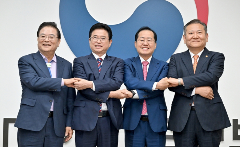 우동기(왼쪽부터) 지방시대위원장, 이철우 경북지사, 홍준표 대구시장, 이상민 행정안전부 장관이 21일 오후 서울 종로구 정부서울청사에서 열린 대구·경북 통합 관련 4자 회동에서 합의문에 서명한 뒤 기념촬영을 하고 있다.<사진=경북도제공>