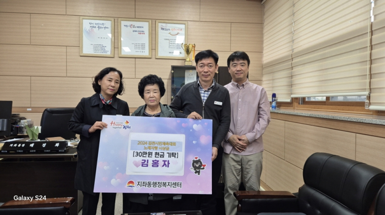 김천시 지좌동행정복지센터에 지난 15일‘2024 김천시민체육대회’시민노래자랑에서 지좌동 대표로 출전하여 1등을 수상한 김홍자님께서 방문해 관내 복지사각지대에 놓인 주민을 위해 시상금 30만 원을 전달했다.