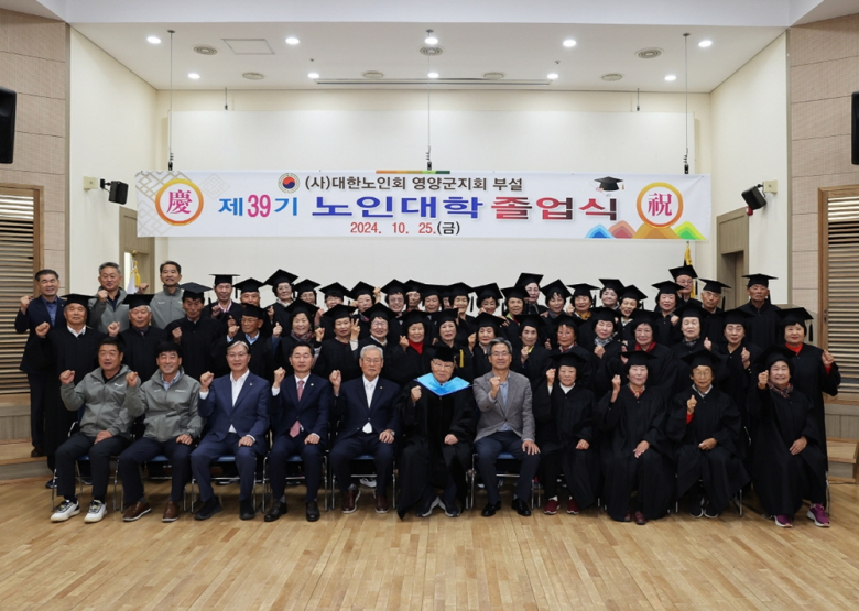 (사)대한노인회 영양군지회 부설 노인대학은 25일 영양군종합복지회관 강당에서 제39기 노인대학 졸업식을 가졌다.이날 졸업식에는 53명(남자 10명, 여자 43명)의 노인대학 졸업생과 지회 임원 등 70여 명이 참석한 가운데 졸업식을 가졌으며, 노인강령 낭독, 개근상, 정근상 수여, 졸업증서 수여 등의 순으로 진행됐다.지난 4월 개강한 제39기 (사)대한노인회영양군지회 부설 노인대학은 매주 금요일 명사초청 특강, 인문학 강좌, 요가· 노래교실 등 다양한 프로그램을 운영해 어르신들의 건전한 여가선용과 배움의 터전이 되어왔다. 올해는 총 53명의 졸업생이 모든 과정을 마치고 빛나는 졸업장을 수여받았다.박성길 노인대학장은 이날 기념사에서 “배움에 대한 열정으로 정규과정을 잘 따라온 학생들의 졸업을 축하하며, 언제나 오늘이 첫날이라는 마음으로 살아주길 바란다”라고 말했다.