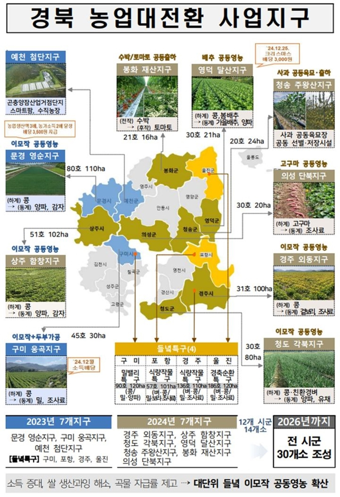 공동영농으로 소득을 배당하는 새로운 개념의 영농모델인 경북 농업대전환이 도내 전역에서 빠르게 확산하고 있다.12일 경북도에 따르면 영덕 달산지구는 다음 달 25일 크리스마스에 2모작(콩·양파+배추) 공동 영농 첫 배당 3000원(3.3㎡당)을 지급한다.공동 영농을 이끄는 팔각산절임배추영농조합법인 백성규 대표는 기존 벼농사를 짓던 21ha 농지를 30여 농가와 함께 배추로 전환, 2모작 공동 영농을 하고 있다.21ha의 논에 벼농사만 지으면 1억4800만원에 불과한 농업생산액이 배추, 콩·양파 이모작으로 전환하면 약 4배로 증가한 6억2500만원이 된다.여기에 절임 배추로 가공하면 11억2500만원으로 8배가량 높아진다.달산영농지구는 2015년부터 절임 배추 가공사업을 추진해온 백 대표의 경험과 노하우에 공동 영농 배추 가공까지 더해져 생산성과 소득을 같이 높일 수 있게 됐다.법인은 12월 첫 배당 후 다음 해 8월엔 봄배추, 양파 수확·판매 후 추가 배당도 지급한다.고향인 달산면이 사라질지 모른다는 위기감에 2017년 귀농을 결심하고 법인에 합세한 백운영 영농법인 팀장은 "내가 이 마을에서도 유일한 청년이다. 처음 혁신농업타운을 시작할 때 과연 해낼 수 있을까 엄두도 안 났지만, 농가들과 함께하니 희망이 보였다"며 "현재 21ha에서 50ha까지 인근 지역으로 확대해 고향 달산면의 명맥을 잇겠다"고 말했다.지난해부터 공동 영농을 추진 중인 구미(무을면)에서도 연말에 소득을 배당한다.하절기에는 콩과 특수미를, 동절기에는 조사료 등 2모작 공동 영농과 더불어 두부 가공 등 융복합 사업과 연계해 새로운 부가가치를 창출해 가고 있다.경북 최대 평야지인 의성에서도 농업대전환에 한창 진행되고 있다.기존 벼농사에서 고구마·조사료로 전환해 농가 소득 배가뿐만 아니라 마늘, 자두에 이은 새로운 소득작물로 의성 농업의 부흥 시대를 열어간다.이 외에도 경주, 청도, 상주에서도 벼 대신 콩, 양파·조사료 등 다른 작물로 전환해 경북형 농업대전환이 순항 중이다.경북형 농업대전환(혁신농업타운 조성)은 지난해에는 문경 영순면(콩+양파·감자), 구미 무을면(콩+밀·조사료), 예천 지보면(첨단형-곤충산업화센터, 스마트팜, 수직농장) 등 7곳에서 처음 진행됐다.올해는 경주 외동면(콩+조사료·찰보리), 상주 함창읍(콩+양파·감자), 의성 단북면(고구마+조사료), 청송 주왕산면(사과 공동육묘 등), 영덕 달산면(콩+양파·배추), 청도 각북면(콩·친환경벼+유채·양파), 봉화 재산면(수박+토마토) 등 7곳이 새로 추가돼 현재 14곳에서 추진 중이다.혁신농업타운은 민선 8기에 들어 이철우 도지사가 역점을 두어 추진하는 농업대전환 핵심 시책으로 첨단화·규모화·기계화를 통한 2모작 공동영농으로 생산성과 소득을 높이는 새로운 개념의 농촌 마을이다.성공모델이 된 `문경 영순지구`는 법인대표와 젊은 청년들이 주축이 돼 공동영농 법인을 만들고 벼농사 대신 콩, 양파·감자를 2모작으로 경작하고 있다.규모화·기계화로 농업생산액은 3배, 농가 소득은 2배라는 엄청난 성과가 나타났다.경북도는 내년에는 콩, 조사료 등 논 다른 작물 전환과 대규모 들녘 단위로 시군 지역 특색에 맞는 자율계획을 수립해 농업대전환을 정착시키고 2026년까지 도내 전 시군에서 30곳의 혁신농업타운을 만들 계획이다.이철우 경북지사는 "첨단화·규모화·기계화를 통한 농업대전환의 성공을 확인했다. 이제는 확산과 동참이 중요한 시기"라며 "농촌의 들녘 10%만 벼농사에서 다른 작목으로 바꿔도 농업이 달라진다. 전 시군, 더 나아가 전국으로 확산시켜 대한민국 경북에서 농정 패러다임을 바꿔 나가는 데 앞장서겠다"고 말했다.김성용 기자