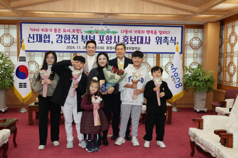 포항시는 26일 지역의 5남매 자녀를 둔 신재협, 강한진 부부를 ‘포항시 홍보대사’로 위촉했다고 밝혔다. 이번 홍보대사 위촉으로 부부는 다둥이가족의 행복을 전파하고 아이키우기 좋은 돌봄 도시 포항을 널리 알리는 역할을 하게 된다. 특히 자녀 양육 경험과 가족의 행복 이야기를 많은 시민들에게 알리며 육아친화도시 포항에 대한 긍정적인 메시지를 대내외에 전달할 수 있을 것으로 기대된다. 이강덕 시장은 “다복한 가정을 이루며 지역 사회에 긍정적 에너지를 불어넣고 있는 부부가 포항시의 홍보대사로 위촉돼 기대감이 높다”며 “저출생 문제는 재정적 지원만으로 해결하기 어려운 문제인 만큼 시민들이 출산 장려 정책에 공감하고, 인식을 개선할 수 있도록 폭넓은 활동을 기대한다”고 말했다.