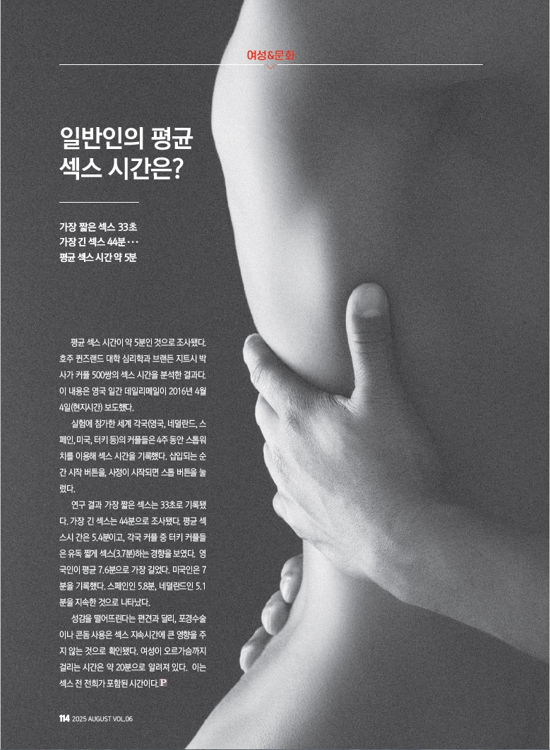 평균 섹스 시간이 약 5분인 것으로 조사됐다. 호주 퀸즈랜드 대학 심리학과 브랜든 지트시 박사가 커플 500쌍의 섹스 시간을 분석한 결과다. 이 내용은 영국 일간 데일리메일이 2016년 4월4일(현지시간) 보도했다.
