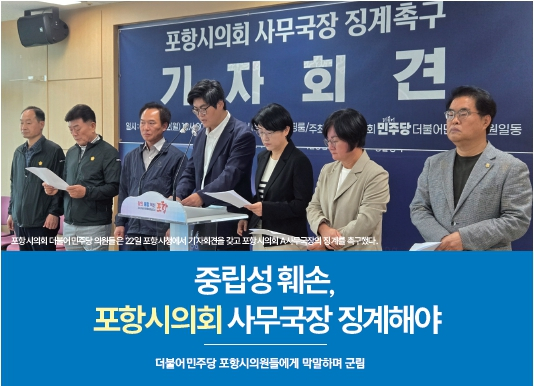 포항시의회 더불어민주당 시의원들이 ‘막말과 중립성 훼손’을 이유로 의회 사무국장의 징계를 촉구하고 나섰다. 이들은 22일 포항시청에서 기자회견을 갖고 "포항시의회 A사무국장이 중립을 지키지 않고, 의원들에게 막말을 하는 등 군림하려 한다"고 주장했다.