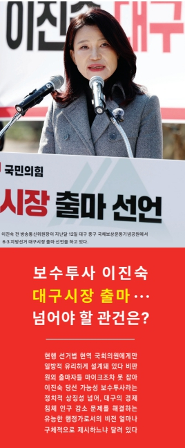 현행 선거법 현역 국회의원에게만일방적 유리하게 설계돼 있다 비판원외 출마자들 마이크조차 못 잡아이진숙 당선 가능성 보수투사라는정치적 상징성 넘어, 대구의 경제침체 인구 감소 문제를 해결하는유능한 행정가로서의 비전 얼마나구체적으로 제시하느냐 달려 있다